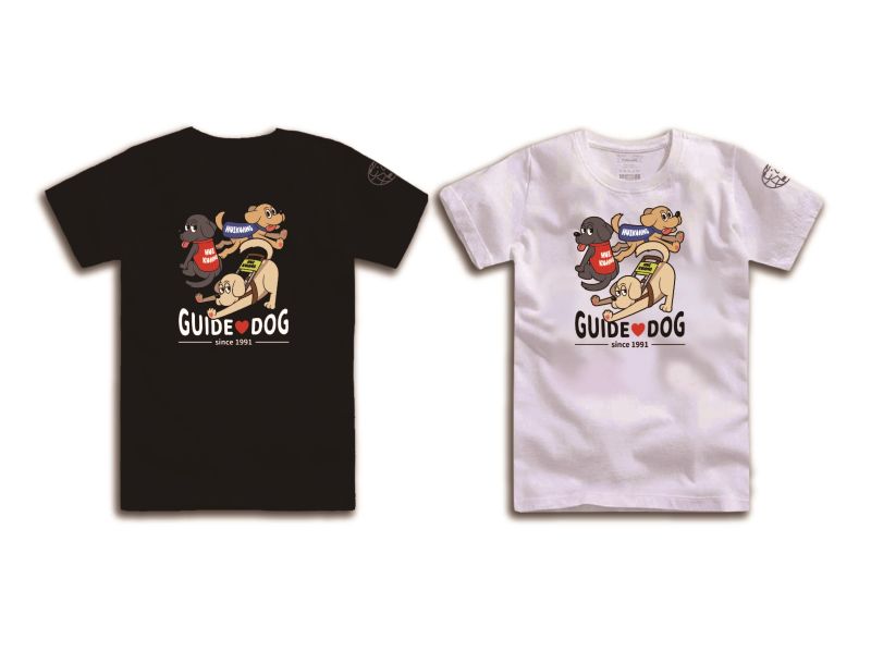 穿「導盲鞍」的工作犬陪伴穿「培訓中紅色背心」的導盲幼犬,導盲犬活潑造型圖案,獨特時尚穿搭。